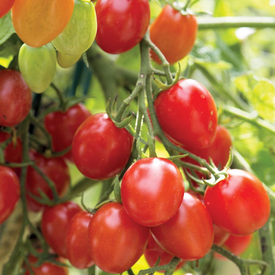 This super-productive plant is a powerhouse, setting up to 350 fruits (about 12 pounds) of deep red, glossy, smooth ½-ounce grape tomatoes. The skin resists cracking, the bite is a good combination of sweet and tangy, and the yields are amazing. You just can't lose with this one.