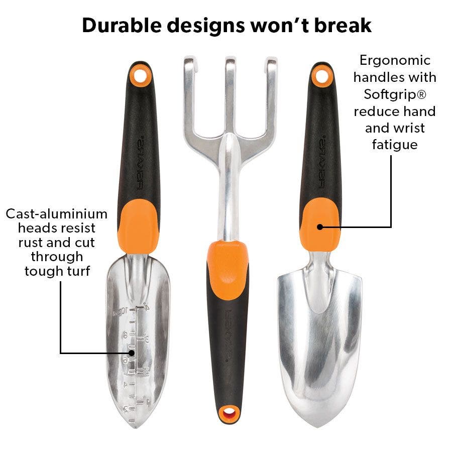 Cultivator - for aerating, as well as a variety of garden tasks.This 3pc set is constructed of durable, rust-resistant cast aluminum. The sharp blades make it easy to cut through tough soils and sods, and the incredibly strong heft assures these tools won't bend back the first time they hit a rock.