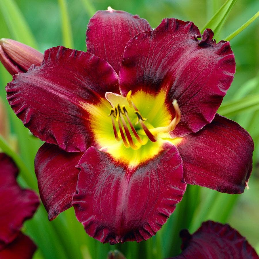 Hemerocallis 'Bela Lugosi' Daylily is a showy, semievergreen perennial blooming in midsummer. A dramatic, reblooming variety with a long bloom period, 'Bela Lugosi' produces 6-inch, trumpet-shaped, true purple flowers with a lime-green throat. The color is sunfast, unusual for a dark color. Each flower lasts one day, but each plant contains several long scapes with multiple buds that open in succession. So, it blooms for weeks, attracting butterflies, bees, and hummingbirds.
