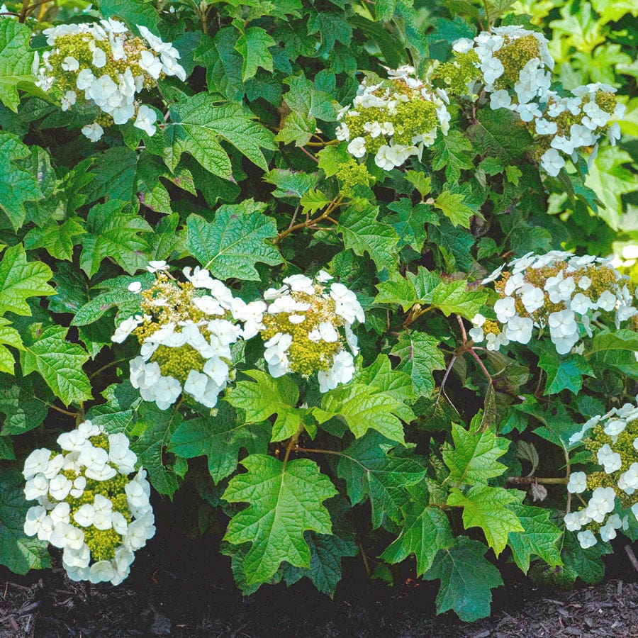 Toy Soldier™, an oakleaf hydrangea from Bloomin' Easy®, is a flowering deciduous shrub that grows to between 4 and 5 feet tall and wide. It blooms continuously in large pyramidal flower heads on old wood from summer through fall. The elongated clusters of white and green florets are held aloft large, deeply lobed, oak-like deep green leaves on sturdy stems. Although they make stunning cut flowers for fresh and dried arrangements, left in the garden, they're a valuable wildlife food source, attracting butterflies and beneficial insects in summer, their seeds attracting songbirds in late fall as the foliage turns brilliant shades of rich vermillion red.