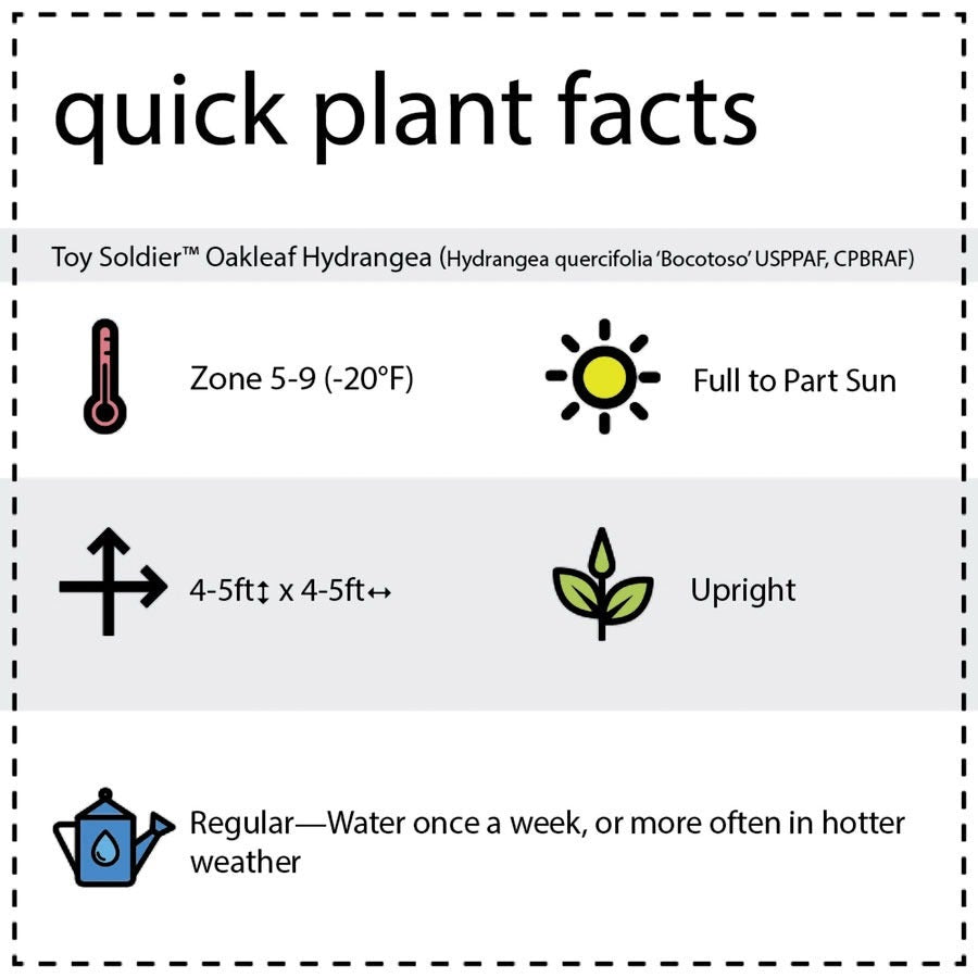 A Hydrangea quercifolia, commonly called oakleaf hydrangea, Toy Soldier is a rugged multi-stemmed, suckering shrub with an upright, broad-rounded habit. Easy to grow and maintain, it prefers morning sun and afternoon shade; fertile, moist, well-drained soil, and plenty of water. The plant requires 4 to 6 hours of full to dappled sun to reach its full potential and can tolerate more if kept well-watered; however, some dappled shade may be beneficial in hot climates. Toy Soldier is not only heat tolerant but also cold hardy to -20°F (-29°C).