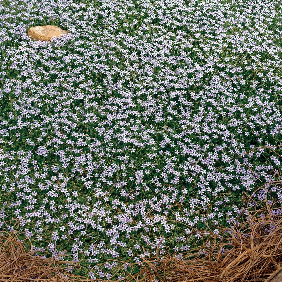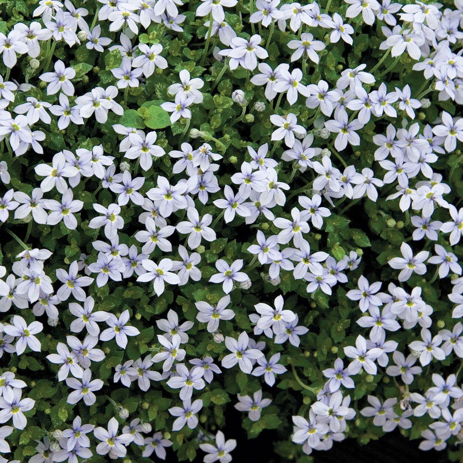 Isotoma Blue Star Creeper is an evergreen perennial ground cover that offers year-round interest and blooms from early spring into summer, creating a colorful carpet of small star-shaped pale blue flowers hovering above a dense, lush mat of fine-textured green foliage.