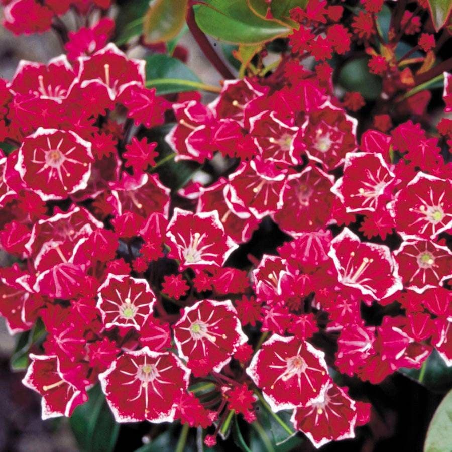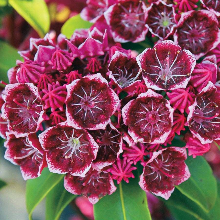 I don't know which is more beautiful on this electrifying Mountain Laurel -- the big, purplish-burgundy blooms edged in white or the 10-pointed buds of brilliant raspberry! Simply the most exciting hybrid yet of this beloved native shrub, 'Keepsake' will live up to its name in your garden, and may just become the centerpiece of the partly-shaded border or patio!
