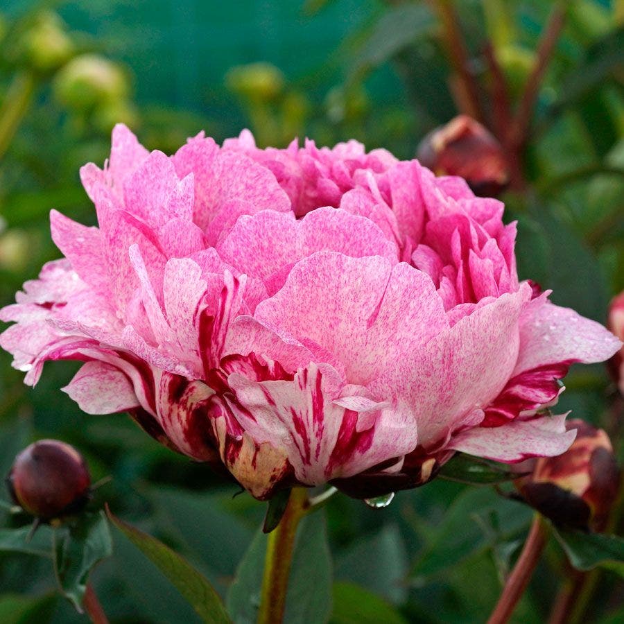 These fawn-like, striped and speckled, pink double blooms are quite rare for a peony. The large, extremely well-formed blooms of Paeonia 'The Fawn' have a light fragrance and are supported by strong dark red stems with attractive green foliageperfect for cutting.