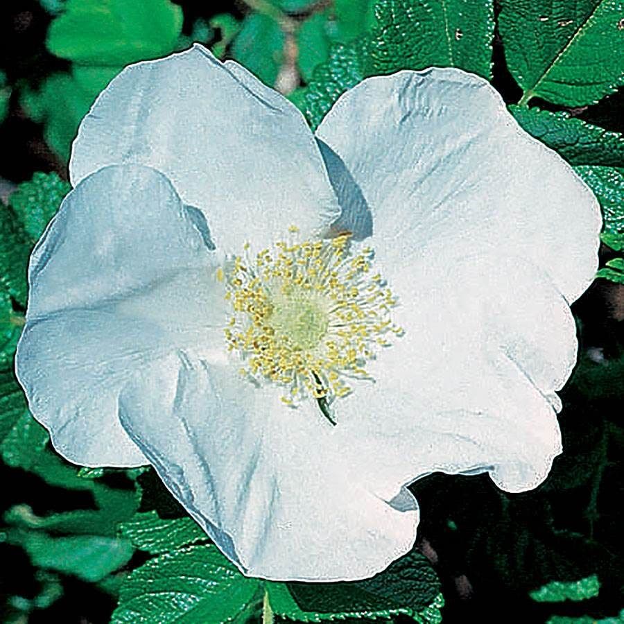 Rosa Rugosa Alba is a naturally occurring species rose with a very round, bushy habit of large, quilted dark green foliage. Left unattended, this suckering deciduous shrub rose can spread to form dense, prickly thickets. The bush is remarkably robust, extremely disease resistant, and incredibly cold hardyup to Zone 2. It tolerates sandy soils and salted sea air, so it grows well in northern coastal regions. A tough shrub rose, Rosa Rugosa Alba is a great choice for the beginner or casual gardener.
