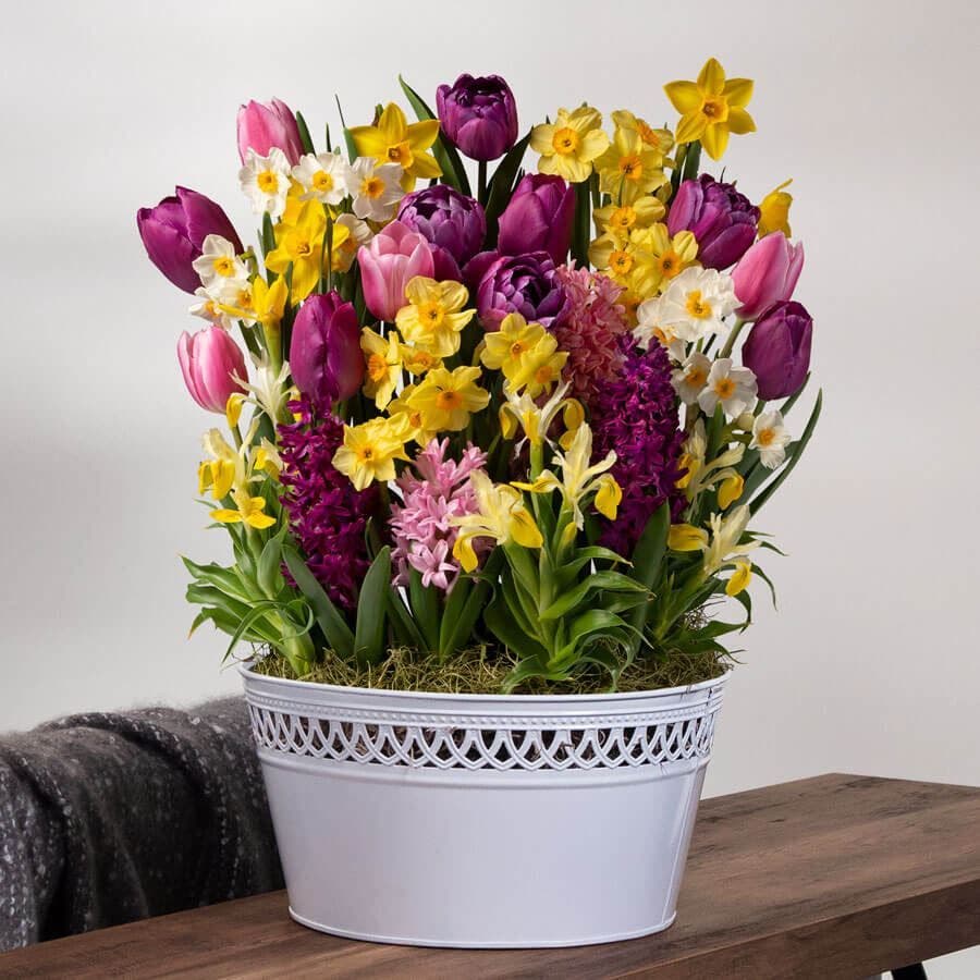 No need to settle for just a few flowers when you can send a bounty of blooms. The ultimate living gift, this lovely spot of spring is a delightful display of cheerfulness and sweet perfume, simply packed with seasonal favorites. This bulb garden includes tulips, hyacinth and narcissus.