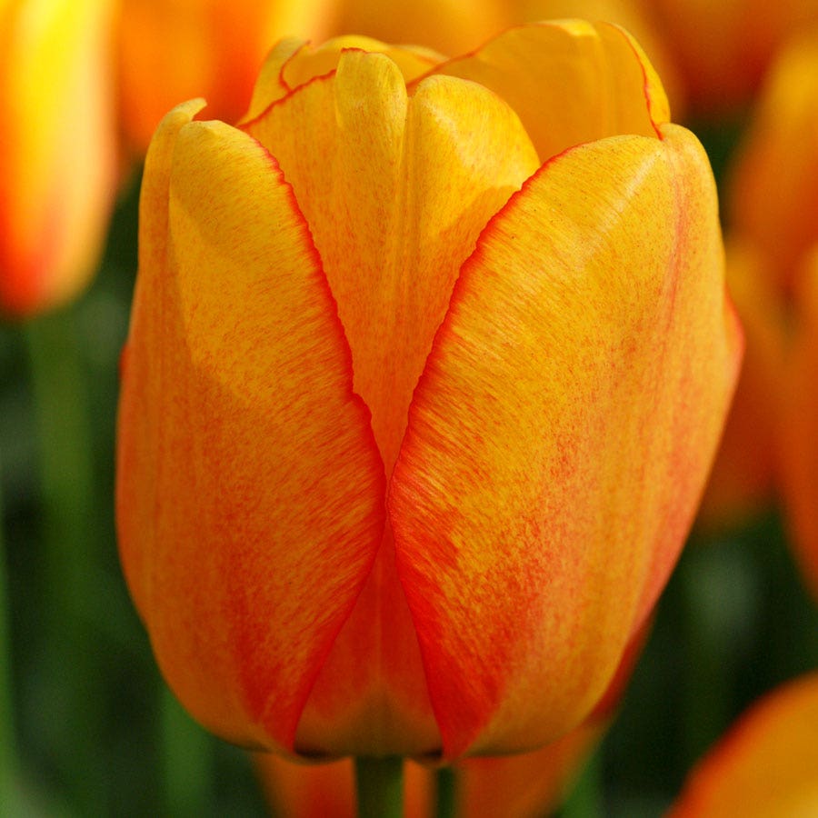 A sport of Tulipa 'Beauty of Apeldoorn', Blushing Apeldoorn, a Darwin Hybrid tulip, blooms mid spring in well-formed, bicolored single flowers, their brilliant yellow petals blushing red. The flowers are fragrant and sit atop tall, sturdy stemsperfect for cutting.
