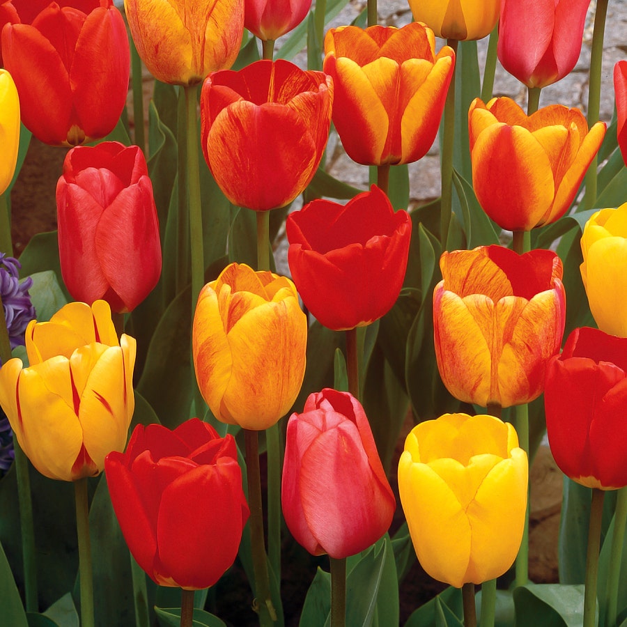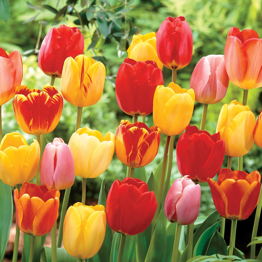 This tulip mix is hand-blended for vivid complementary colors: festive reds, oranges, yellows, pinks, and bicolors. The large, chalice-shaped blooms are fade-resistant and very long-lasting, thanks to waxy petals that hold up to rough weather and thick, sturdy stems that resist bending and snapping. You simply get a better bloom with Darwin Hybrids.
