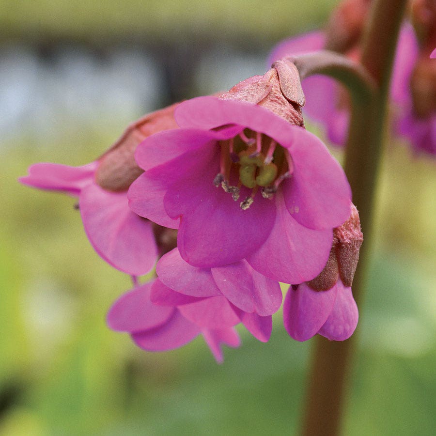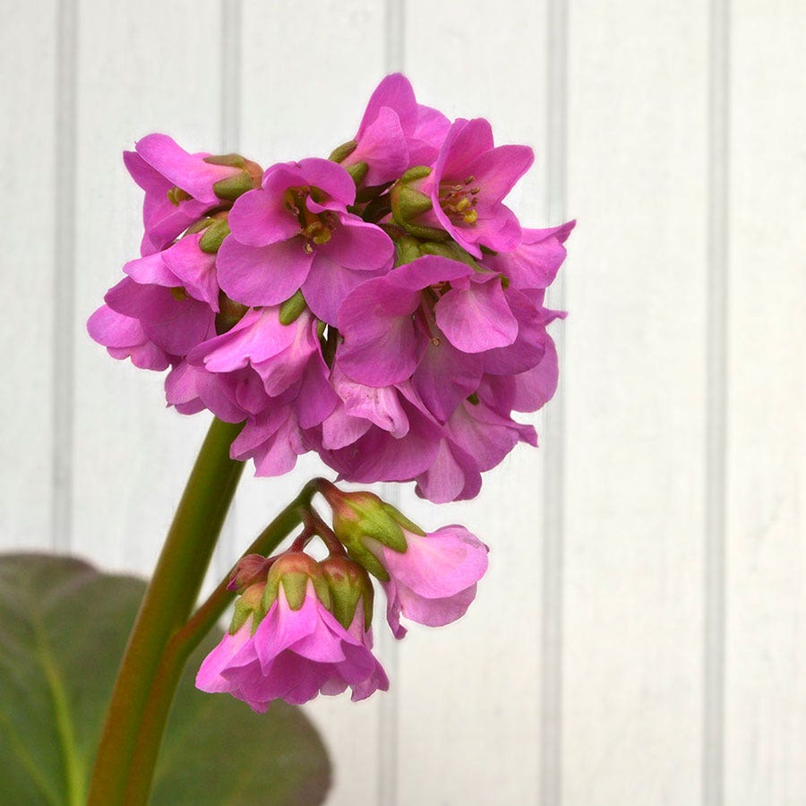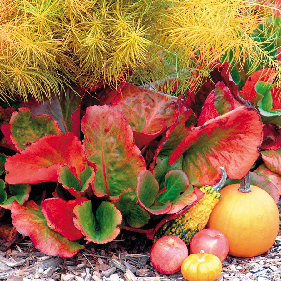 - Description / Bergenia 'Winter Glow'- Synonym 'Winterglut'. - Every shade border should include 'Winter Glow'! Not only is the species B. cordifolia fascinating and useful in itself, but this cultivar adds even more extraordinary color to an already very attractive and useful plant. - The foliage on this plant is very thick -- it will remind you of a succulent -- and bright green, except in fall and winter, when it turns bright, almost glowing shades of bronze and scarlet. The color is nothing short of eye-popping, especially in the bleak winter landscape, when little color except gray and brown is present in the garden. Stunning! - But the color changes on these large, leathery, evergreen leaves are only one of the merits of 'Winter Glow.' This plant also blooms, often twice a year! It can be relied upon for a good show of rosy-pink blooms, held just above the foliage, in spring. But often it tosses in an autumn encore as well! - Both the blooms and the leaves make long-lasting cuts for indoor arrangements, though you will love the color so much in the partly shaded border that you may have trouble cutting even a little bit. No need to fret, though -- this plant has plenty more where that came from! - For all of this talk of giant leaves, 'Winter Glow' is just 12 to 15 inches high and 12 inches wide. But it makes a far bigger impression than its size would suggest. Deer and rabbits leave it alone, dry shade and coastal spray do not bother it, and in general it is impervious to changes in soil and weather. Why can't all plants be more like it? - Grow 'Winter Glow' among your Hostas, Ferns, and Lamium. It is a good companion to other perennials as well as shrubs in the border. You simply can't go wrong with this one! Zones 3-8.